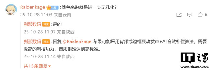 根据博主在评论区的回复,苹果的这步动作简单来说就是进一步无孔化,至于怎么再进一步去掉扬声器、麦克风等开孔,博主认为苹果可能采用背部/边框震动发声+AI音效补偿算法,需要极高的调校功力,音质很难达到高标准。