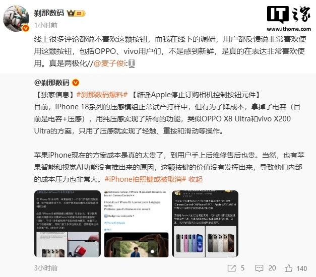 消息称苹果固态按键方案完成验证, iPhone 20系列2027年有望量产